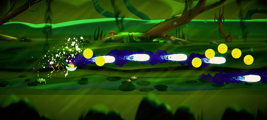 1、轻触屏幕控制角色跳跃和下滑深度,以避免碰撞障碍物;