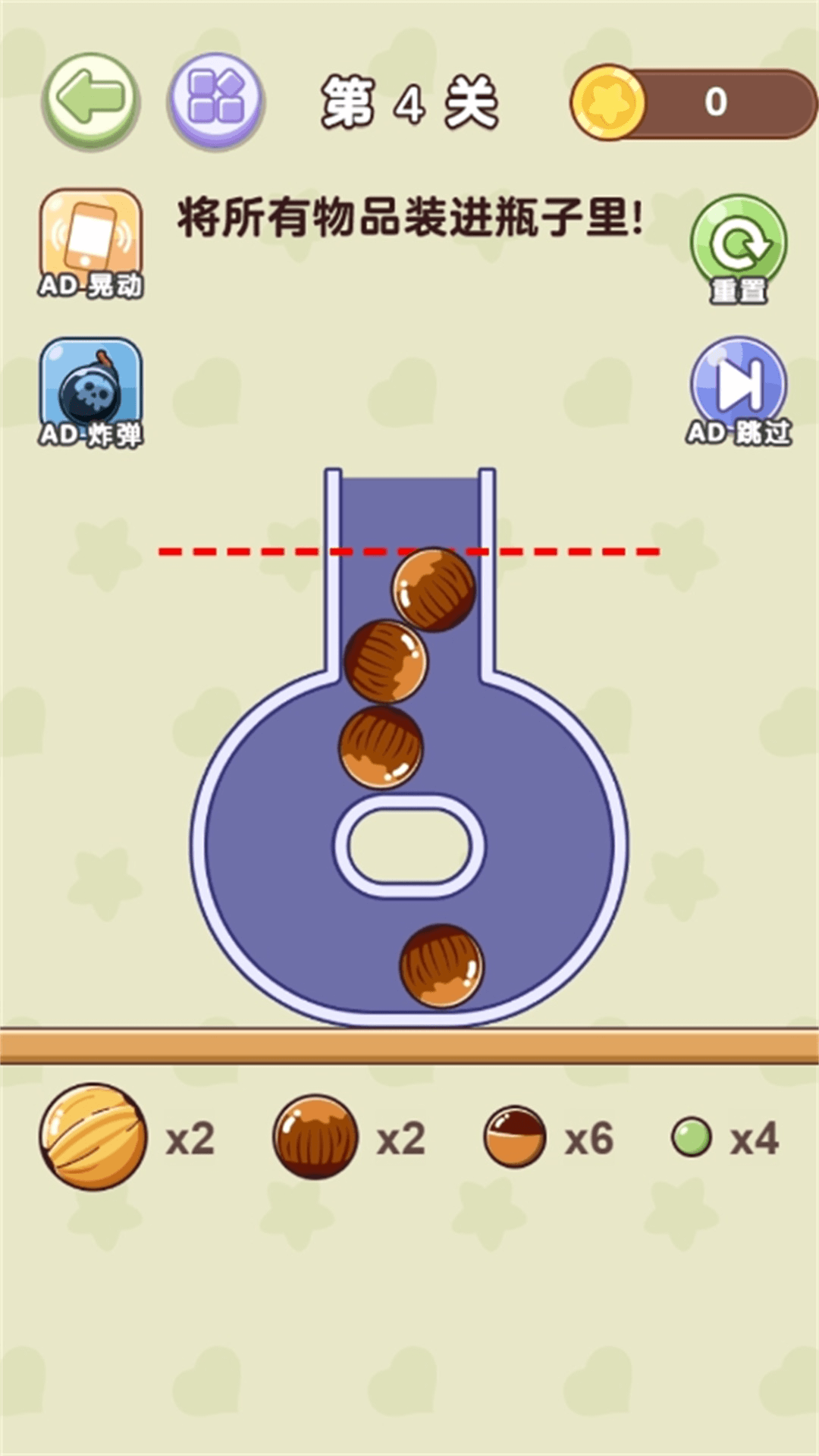 装瓶子是一款充满趣味性和挑战性的脑洞闯关乐行的游戏,在游戏中主题和关卡是多样化的,每个玩家都可以找到自己喜欢的玩法,玩家将会面临各种难题,看似简单、却极其有难度的任务,会让你探索探索和思考,用双手和大脑获得双重乐趣,每个挑战都有不同的解决方案,进行各种关卡的挑战,感受丰富的游戏乐趣。