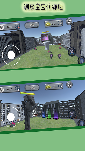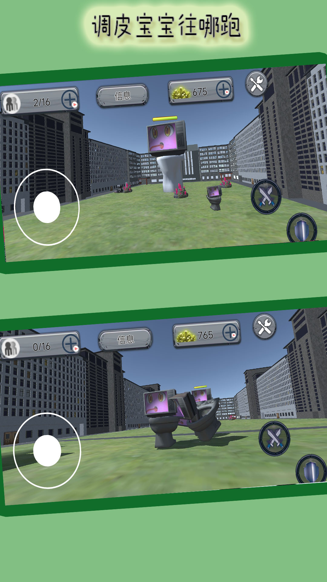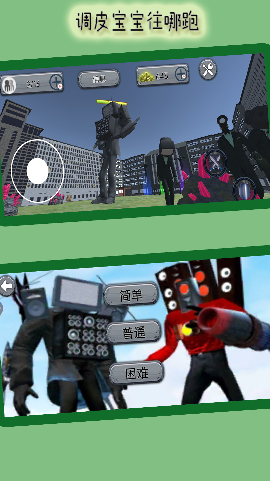 调皮宝宝往哪跑是一款充满趣味性和挑战性的战斗冒险类型的游戏,在游戏中角色形象包括调皮宝宝和电视人宝宝,这两种角色都有着独特的外观和性格,可以在游戏场景中自由探索,面对不同的敌人,开始刺激的对决,与各种物品进行互动,完成不同的任务,享受战斗的刺激乐趣,喜欢的小伙伴快来下载吧!