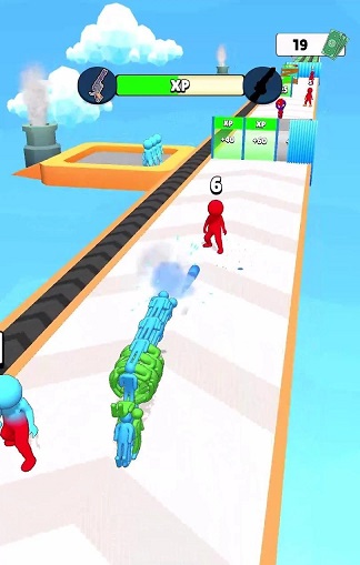 左右滑动屏幕控制角色移动,同时射击路上的小人、躲避障碍、穿越大门获取提升;