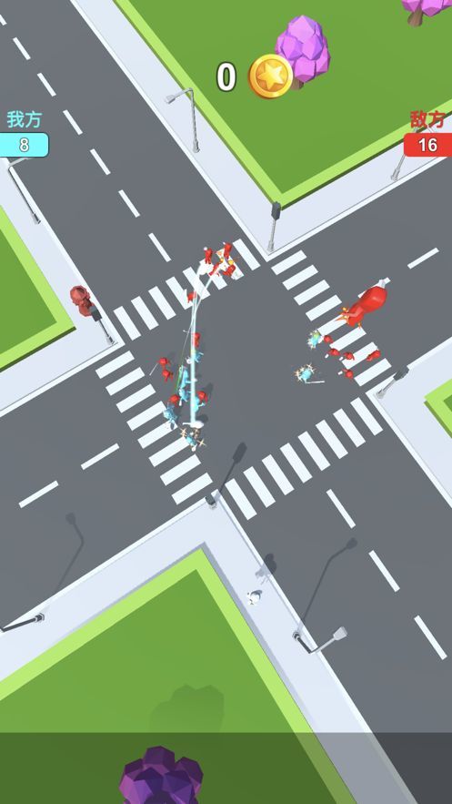 1.清新的画面,在大马路上开始对战,蓝色方和红色方分别率领一群小人开始战斗,这些小人可能还会拿着板凳或者板砖各种武器对战;