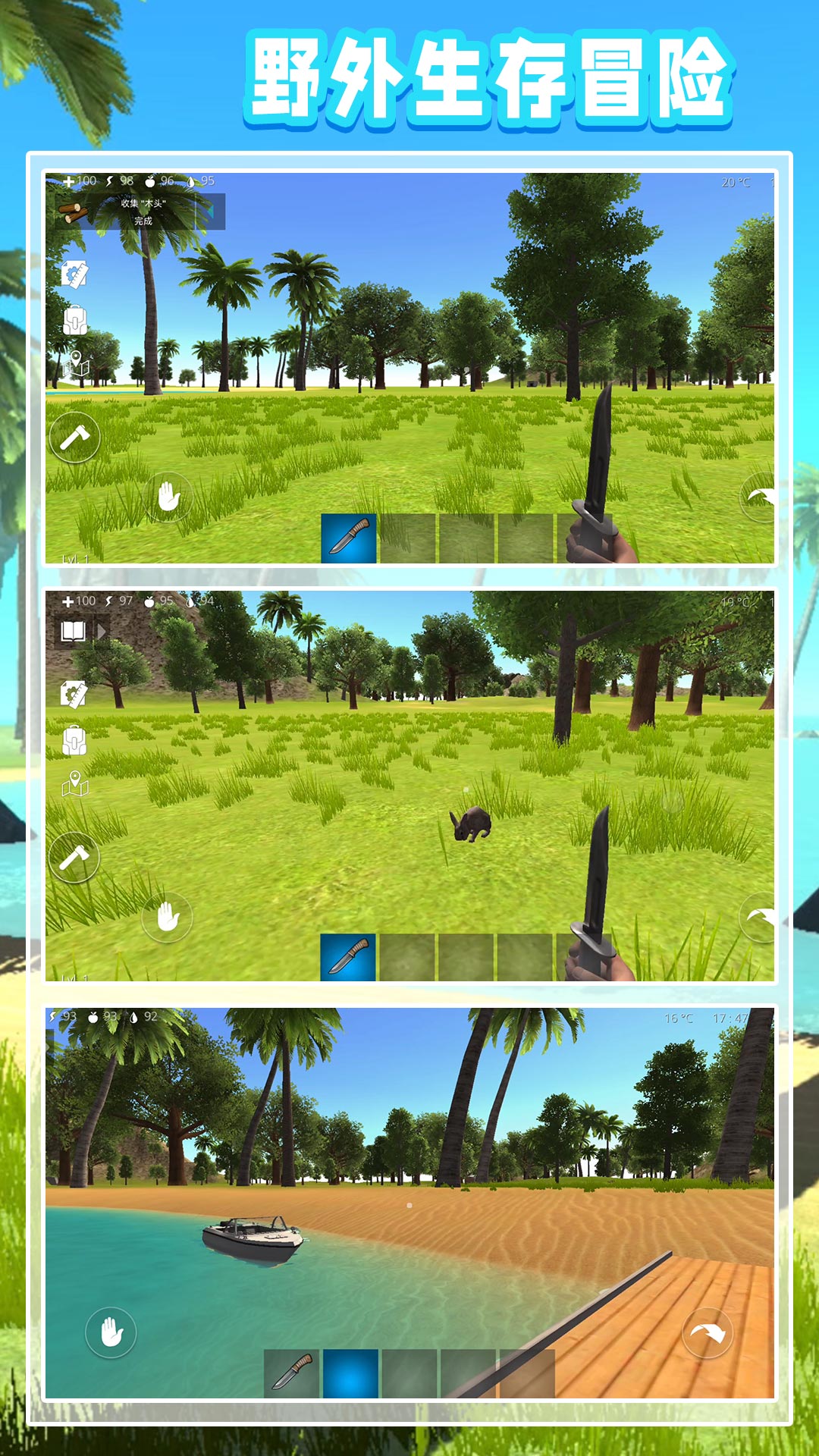 3、要在岛屿上不断的探索,收集各种可以帮助自己存活下去的物资。