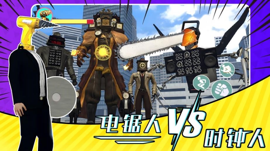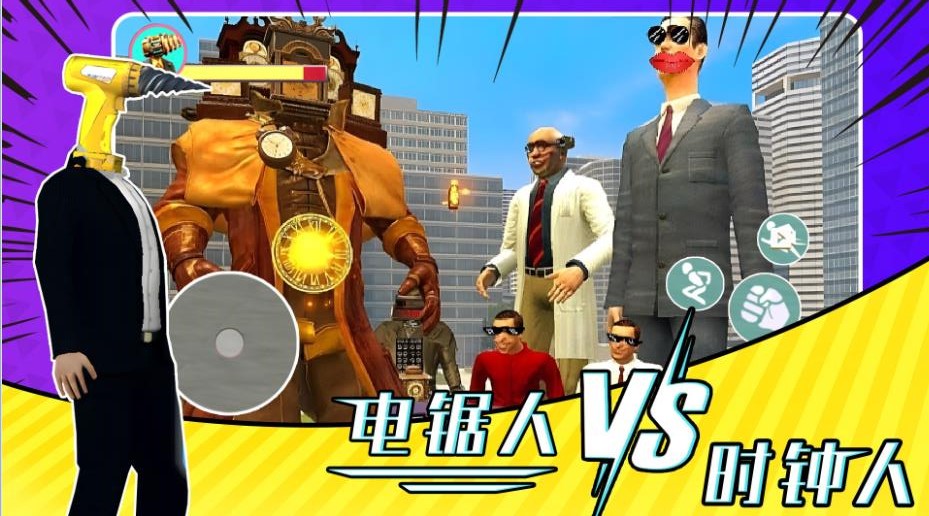 电锯人大战时钟人是一款动作对战游戏,玩家在游戏内将体验到非常热血的对战过程,玩家需要在游戏内打败电锯人,这里融合了多种元素,玩家可以体验到跑酷,动作闯关等等不同元素,丰富的场景带来不一样任务难度,玩家 需要熟练的掌控角色完成任务。