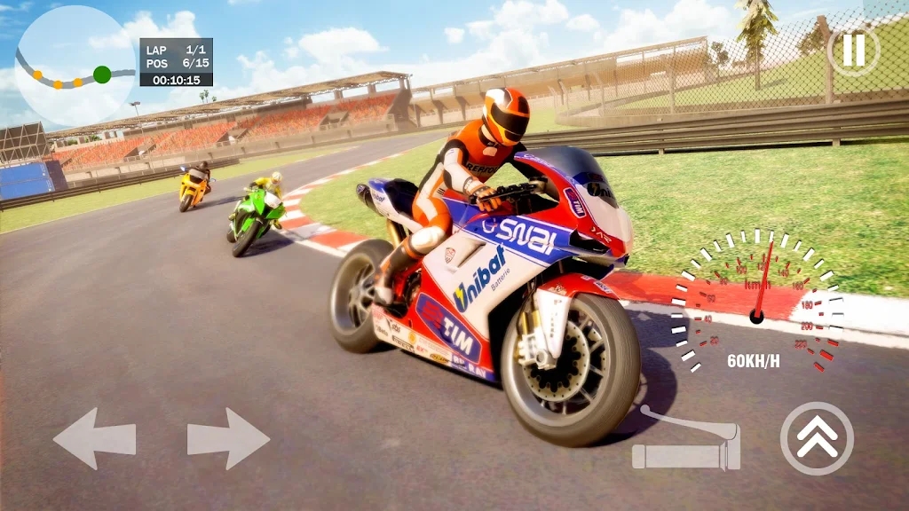 摩托车超级赛车是一款充满刺激挑战的摩托车赛车竞速类型的游戏,在游戏中采用最新的3D渲染技术,呈现出逼真的赛道和车辆,让你仿佛身临其境,玩家将会扮演一名勇敢的摩托车手,参加各种刺激的摩托车竞赛,多种不同的赛道,包括城市街道、短草地、丘陵、沙漠等,每个赛道都有独特的风景和挑战,满足不同玩家的需求,喜欢的小伙伴快来下载吧!