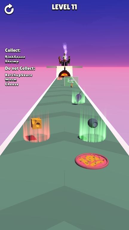 【触屏操作】玩家需要通过滑动屏幕控制角色的移动,穿过各种障碍地形,收集到各种披萨制作材料;