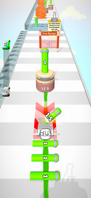 1. 通过滑动屏幕来控制铅笔研磨机的移动,躲避障碍物和敌人;