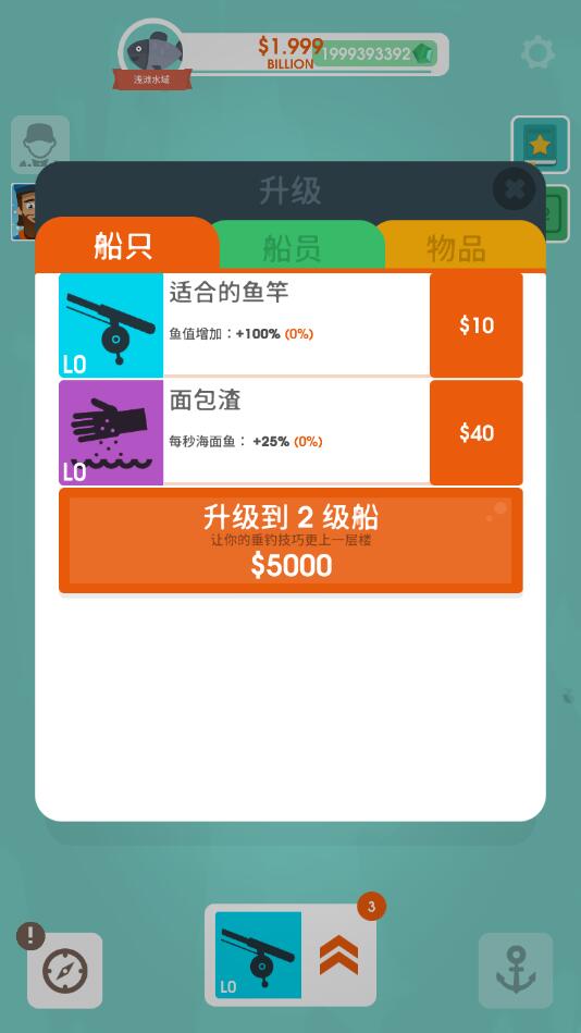 3、雇佣和提拔船员来帮助扩大你的渔业帝国。每个船员都有自己独特的技能来帮助你钓鱼。