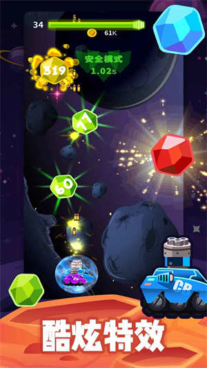 2、灵活控制自己的飞行器躲避各种危险的陷阱,积累自己的金币进行升级,熟练地进行各种操作,引爆各种水晶;