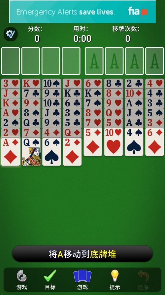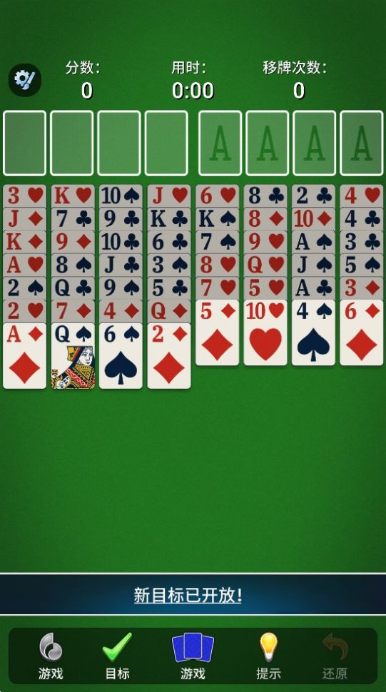 5、如果有可能,需要尽快翻出4张A,因为A是排在最前面的牌。越迟找出A,后面需要移动牌的难度就越大。