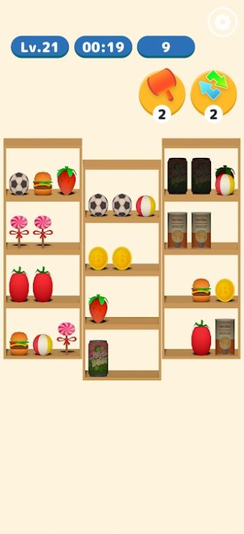 1、将同类型物品放置在一起,通过匹配消除来完成任务目标;