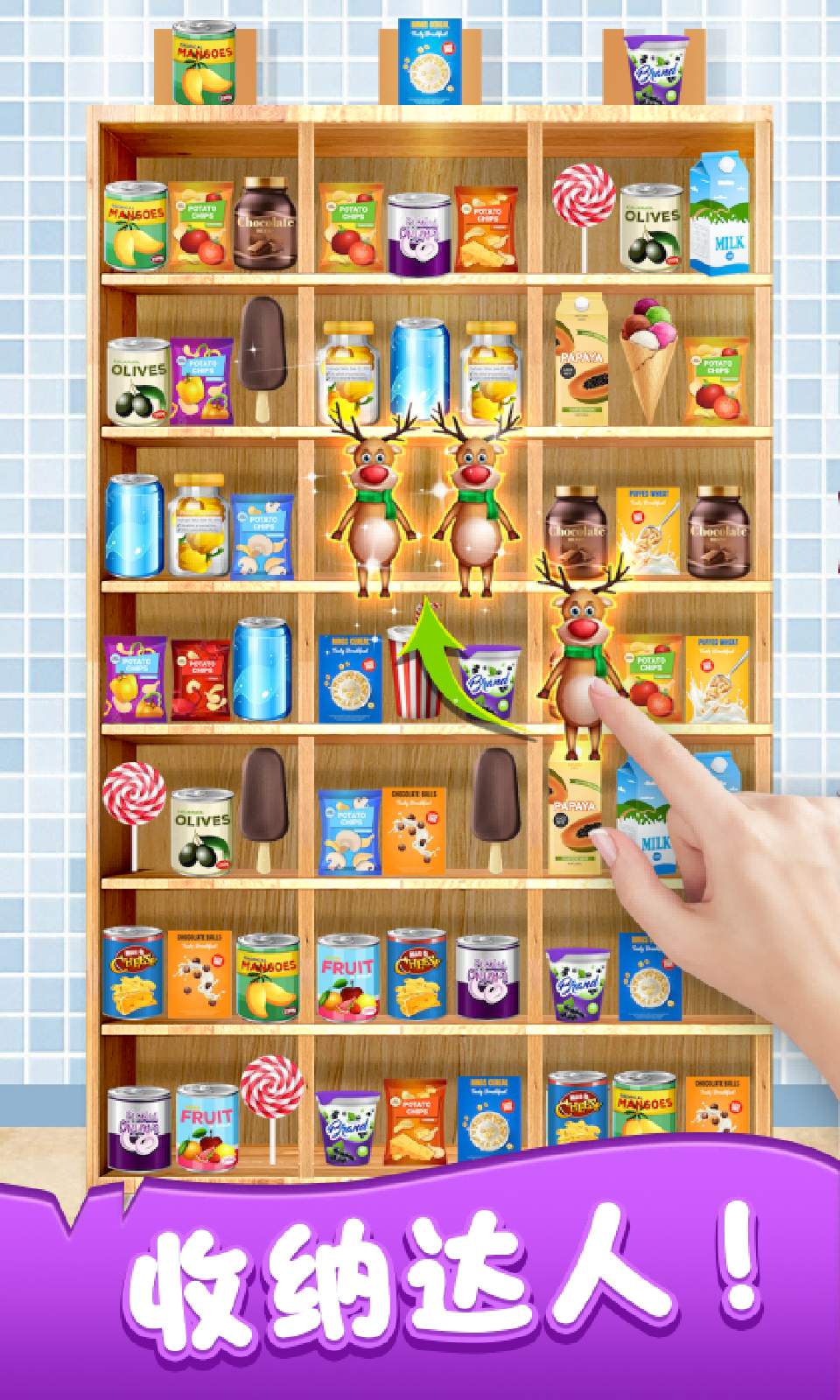 1.消除货柜中相同的零食,让货柜中的物品都完全消除;