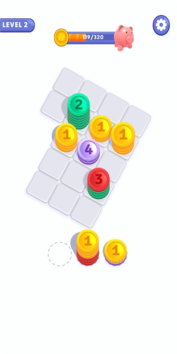 1、独特的金币堆栈难题设计,考验玩家的空间想象和逻辑能力;