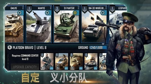 2、即时控制机枪兵、炮兵和犀牛坦克,可升级获得更强大的作战单元和军事力量。