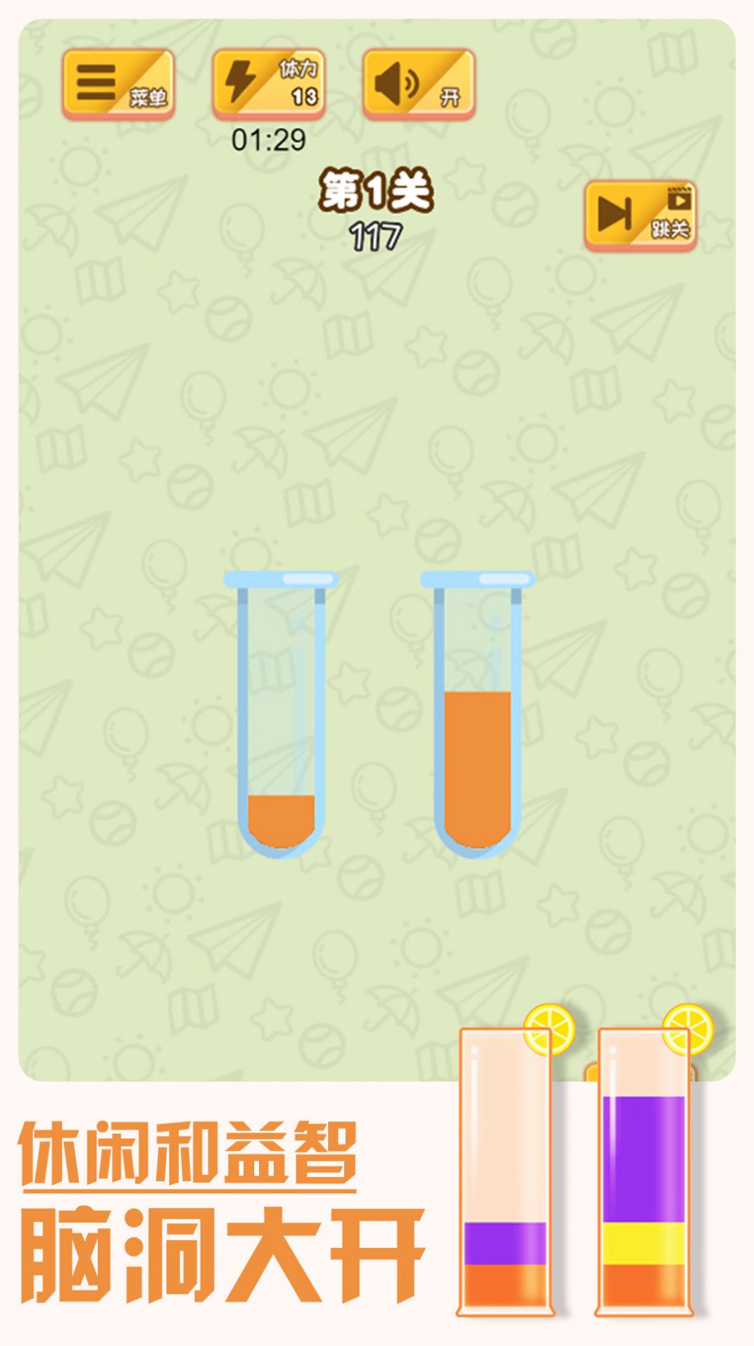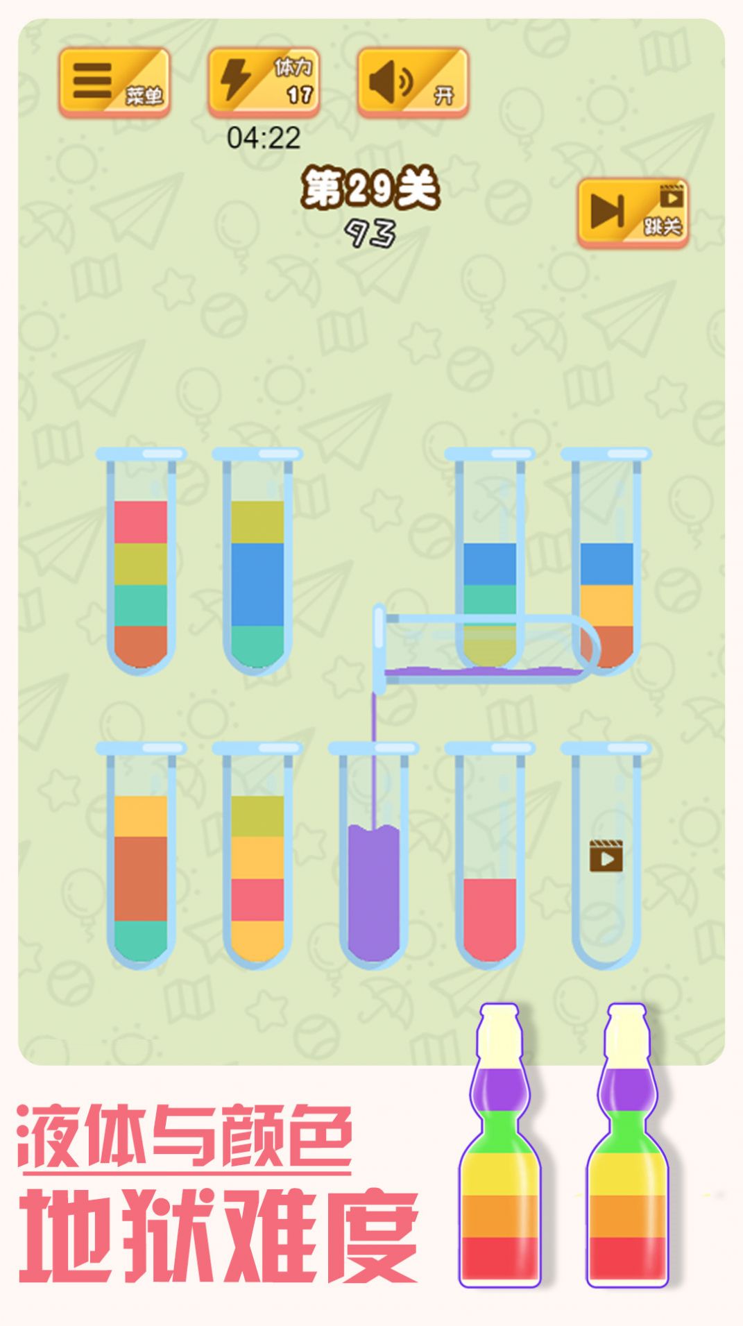 1、各种颜色的液体互不相容,让游戏更具挑战性;