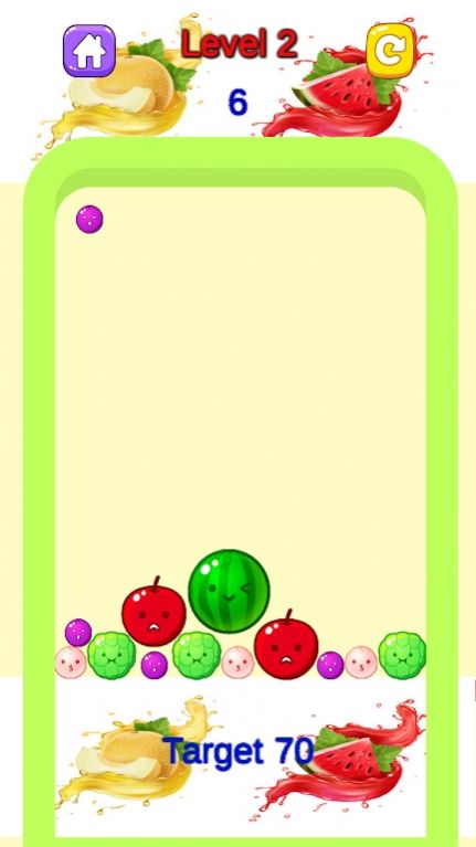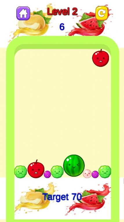 1.合并相同类型的水果时,将它们拖曳到一起即可实现合并。合并后的水果将变得更大,分数也会增加。