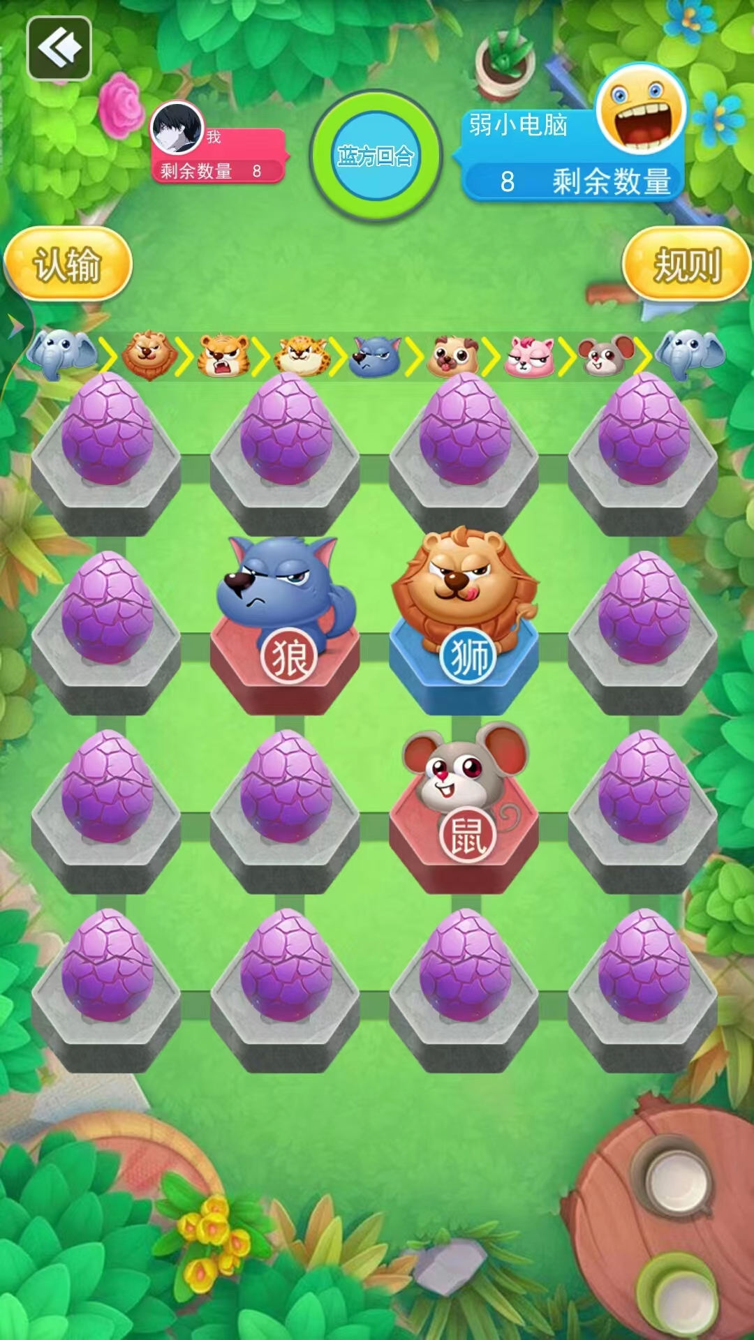 2、通过智能化的棋子移动方式,将动物棋子走到对方的兽穴中,实现胜利;