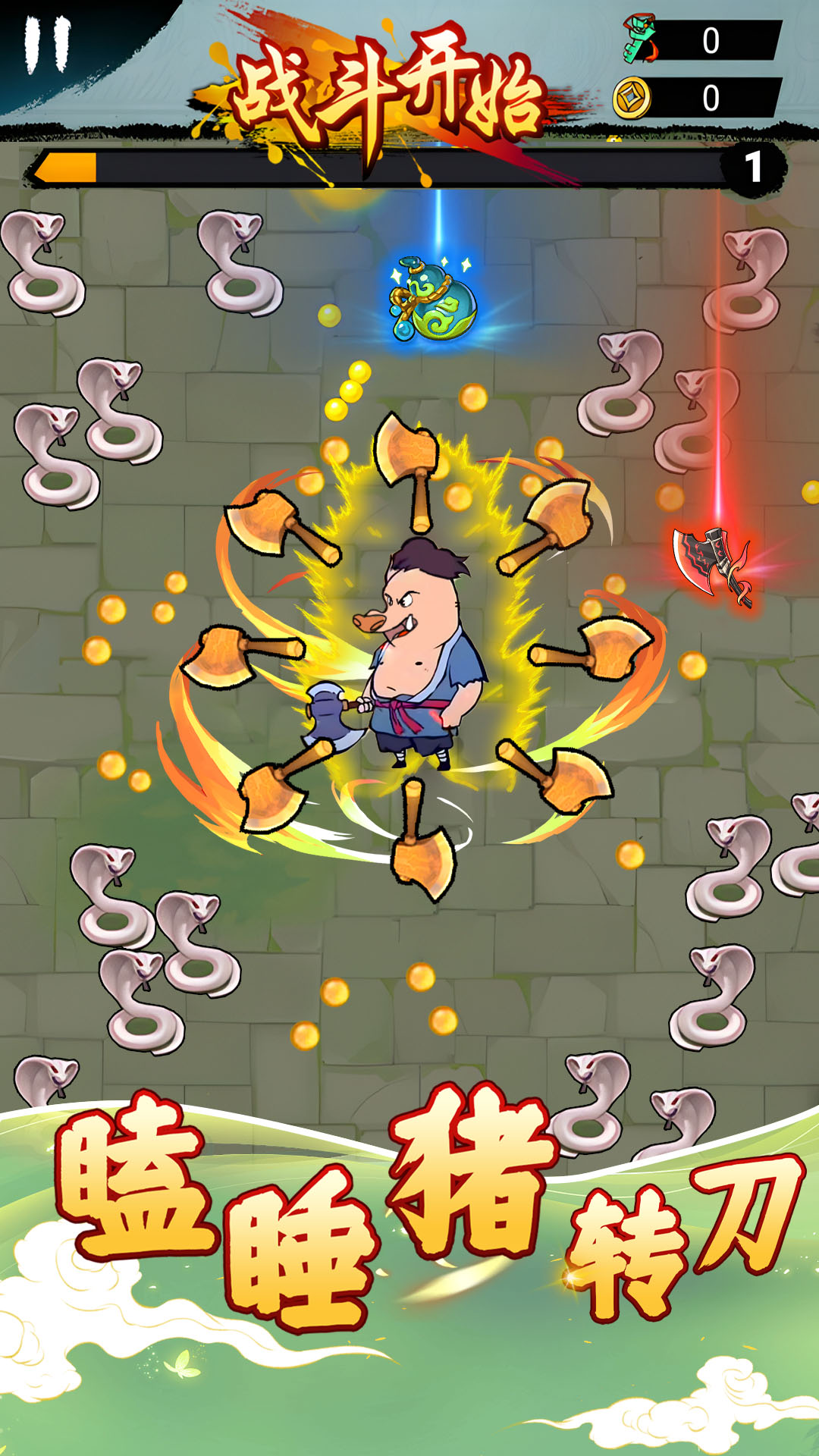 瞌睡猪转刀是一款非常好玩的手机割草闯关题材游戏,这款游戏采用的是古风的游戏画面设计,在这里你要控制一个修仙的小猪在线进行割草修炼,游戏中消灭小怪会获取游戏金币,解锁更加强大的武器装备,在这里你能够体验到前所未有的趣味玩法,更多的隐藏技能解锁等你前来体验。