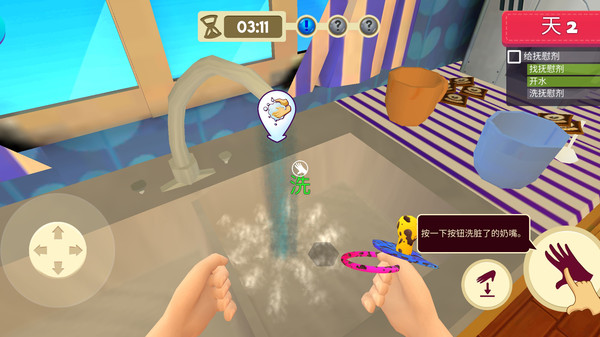 2、玩家学习照顾新生婴儿,用奶嘴安抚他、换尿布、给奶瓶装奶等等
