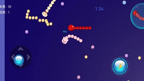 1、通过屏幕上的虚拟摇杆控制蛇的移动。向左或向右移动摇杆,使蛇向左或向右移动;
