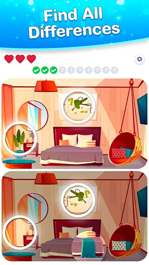 2、独特的找茬模式,每张图片都有5处不同的地方等待发现;