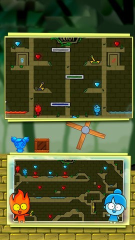 4、当液体面积过大角色无法通过时,寻找机关和石头,控制与液体同色的角色推石头,在液体中铺路,再来一次冰火人通过。