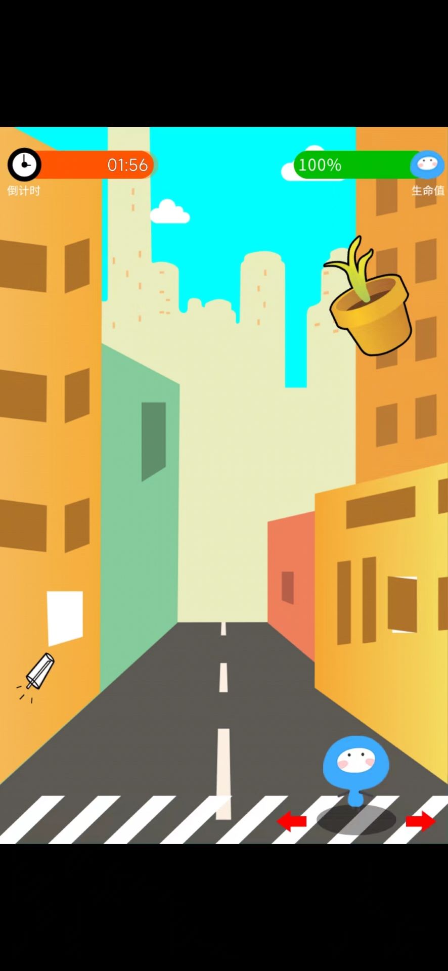 玩家要控制小蓝人经过一段危险的街道,这里随时会有掉落的物品。