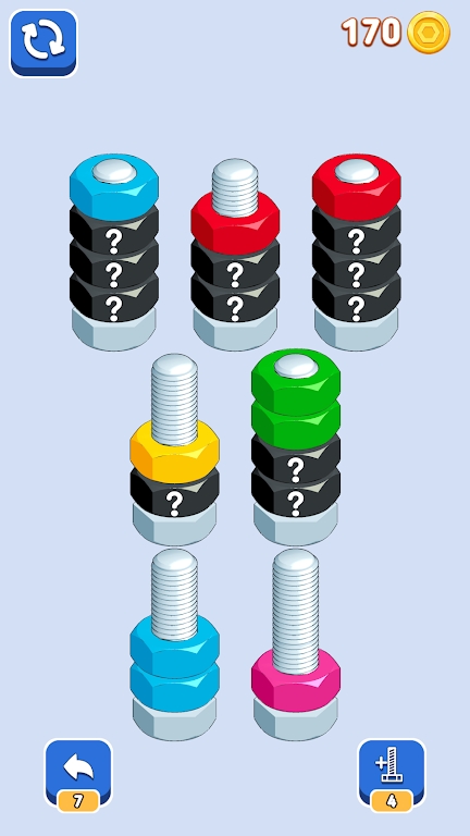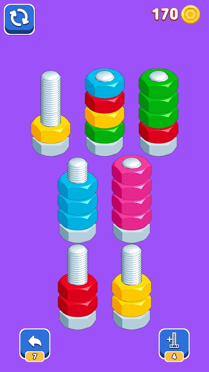 按颜色排序螺母是一款排序游戏,玩家需要在游戏内将各种螺母进行排序,是一款可以锻炼玩家思维能力的游戏,这里的关卡设计很精美,玩家可以在这里尽情的闯关,丰富的游戏内容不会让玩家感到无聊,这里的操作也很简单,控制按钮进行滑动就可以了,赶紧来试试吧。