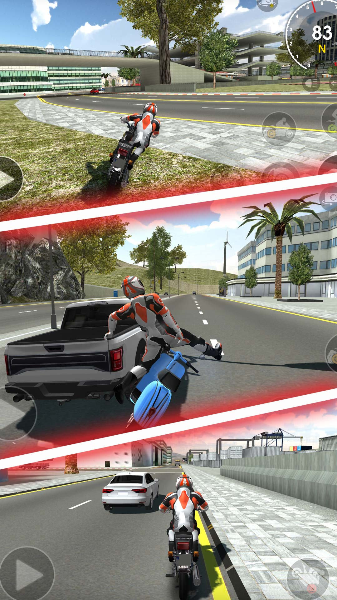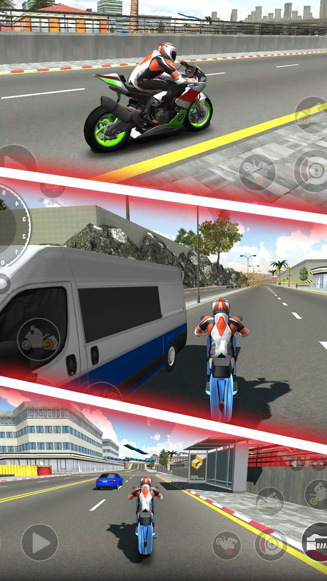 1、逼真的场景和音效将让您身临其境地感受驾驶摩托车的激情和速度;