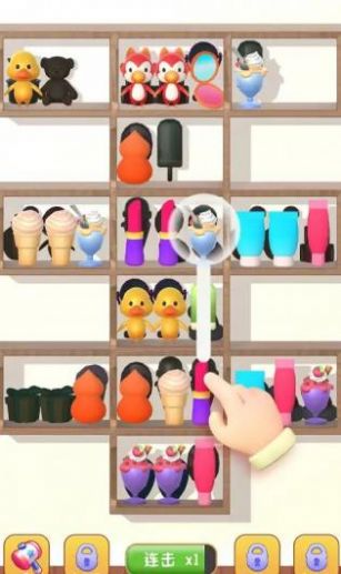 1、移动货架上的商品,将三个或以上相同商品连成一线进行消除;