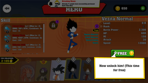 1、多种不同的龙珠斗士可供玩家选择和挑战。有些火柴人英雄需要使用金币来解锁和使用。