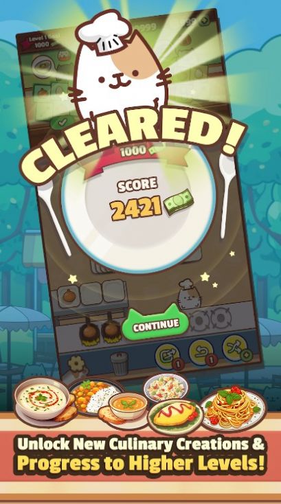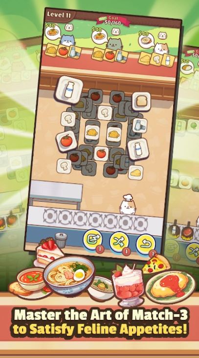 1、收集不同食材,制作各种不同美味的菜肴,还能与猫咪互动;