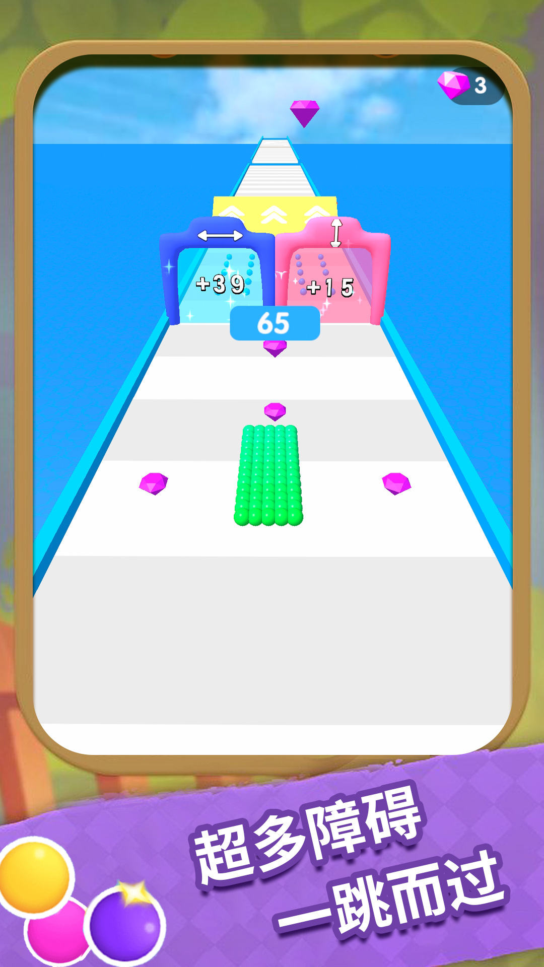 2、滑动屏幕控制小球的运动方向,通过躲避障碍和收集道具来提高得分;