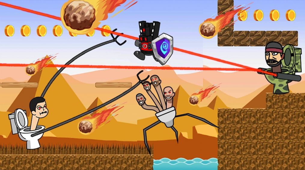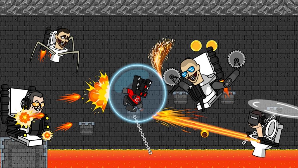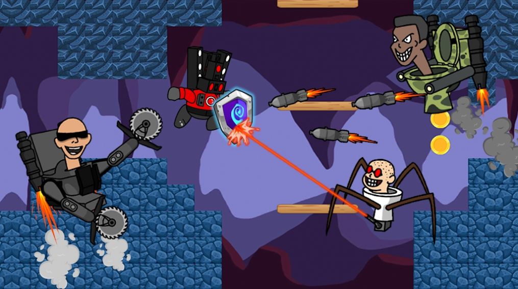 1、控制怪物角色在各种地形和障碍物中进行跳跃,并在马桶人的关卡中过关斩将;
