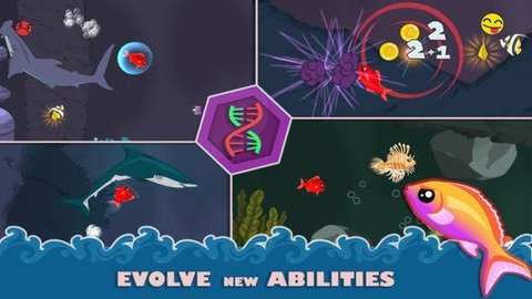 2、游戏自由的冒险设计,在这里你能够通过小鱼自由的探索世界,在这里吞噬周边的生物进化。