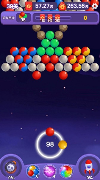 3、一旦三个或三个以上相同颜色的气泡相连,即可将其消除,玩家可以继续升级,挑战更高的难度。