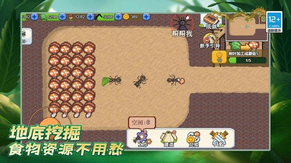 - 探索地底发掘资源:挖掘蚁道,采集生存的必备资源,从无到有建设你的蚁国;