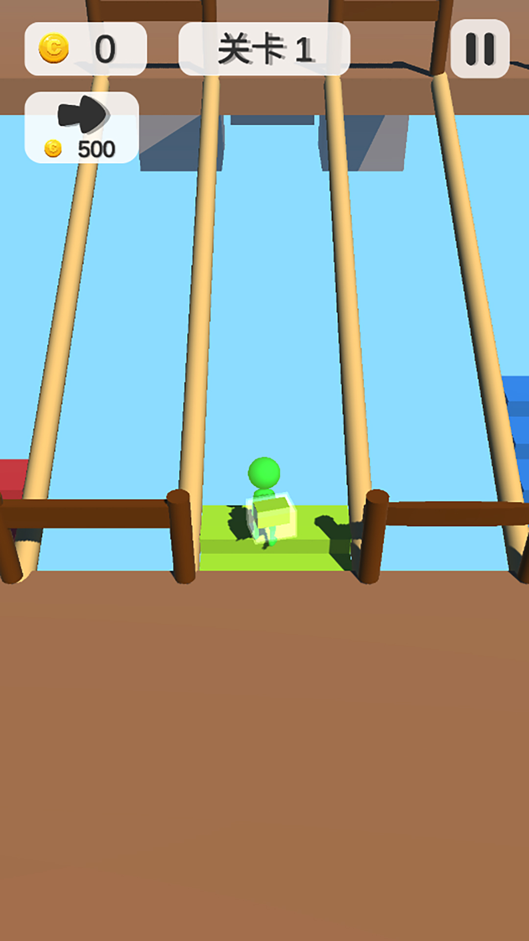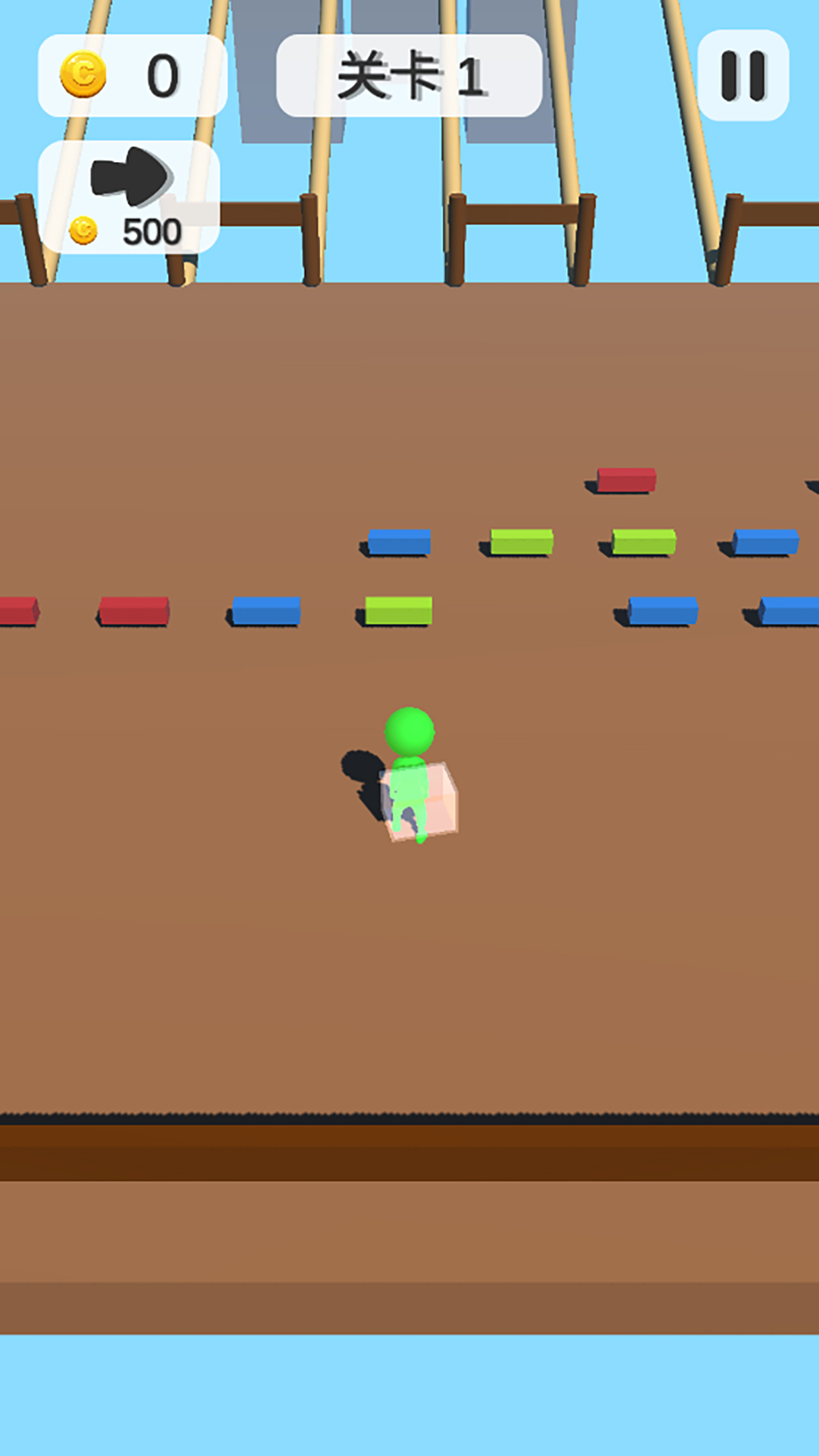 1、控制橡皮人在赛道上奔跑,躲避障碍物,收集散落的砖块;