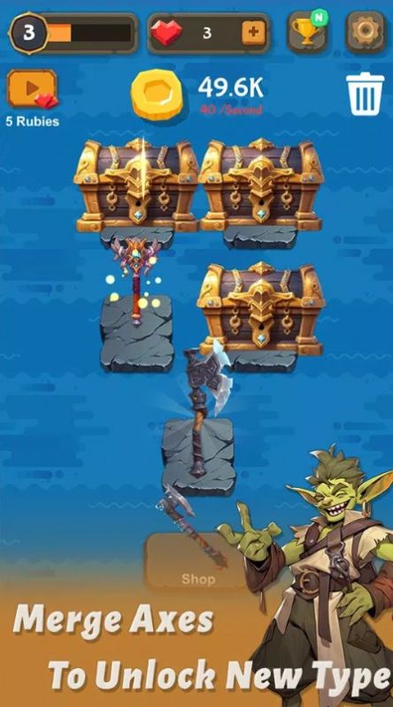 2、将两个低级的斧子进行合并你就能够得到更高级的斧子,不仅造型炫酷并且放置还能够获得更多的金钱。