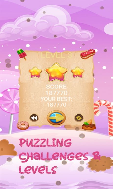 1、以甜甜圈和蛋糕为主题,创新设计丰富多样的消除元素,视觉体验独特新颖;