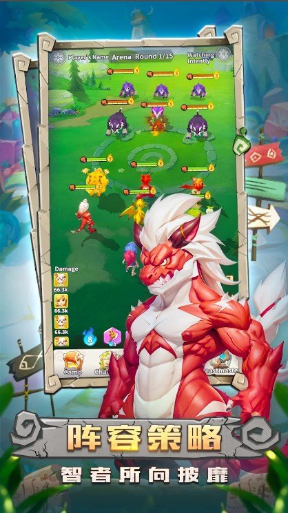 3、游戏的场景画面也是很精美的,每个角色的战斗力都是很强势的,玩家在自己搭建的阵容中探索丛林轻松游戏。