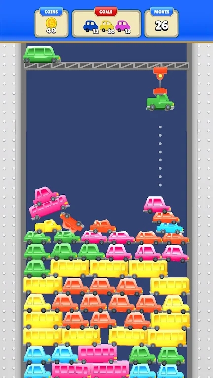 2、玩家需要将游戏内相同颜色的废车来进行消除。