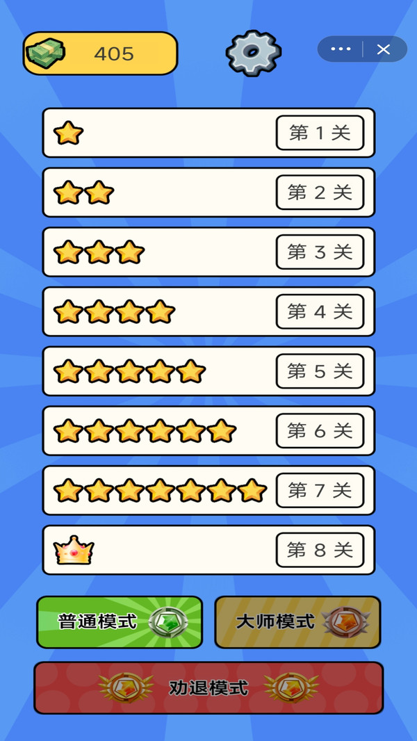 3、每一关的难度等级都不同,你要勇敢的开启挑战,突破自己的等级;