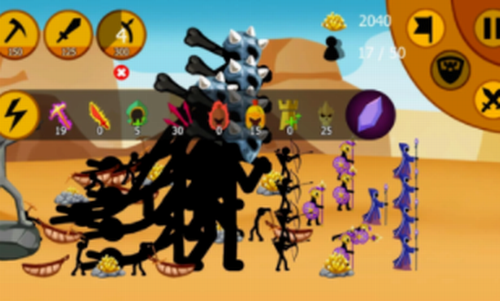 2、摧毁对方国家的雕像,他们运用棍子人物的策略和魔法力量:矿工,剑,矛,弓箭手,巫师,甚至是巨人。