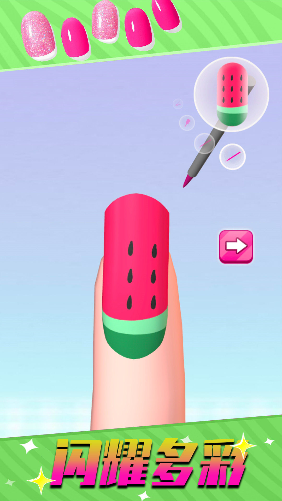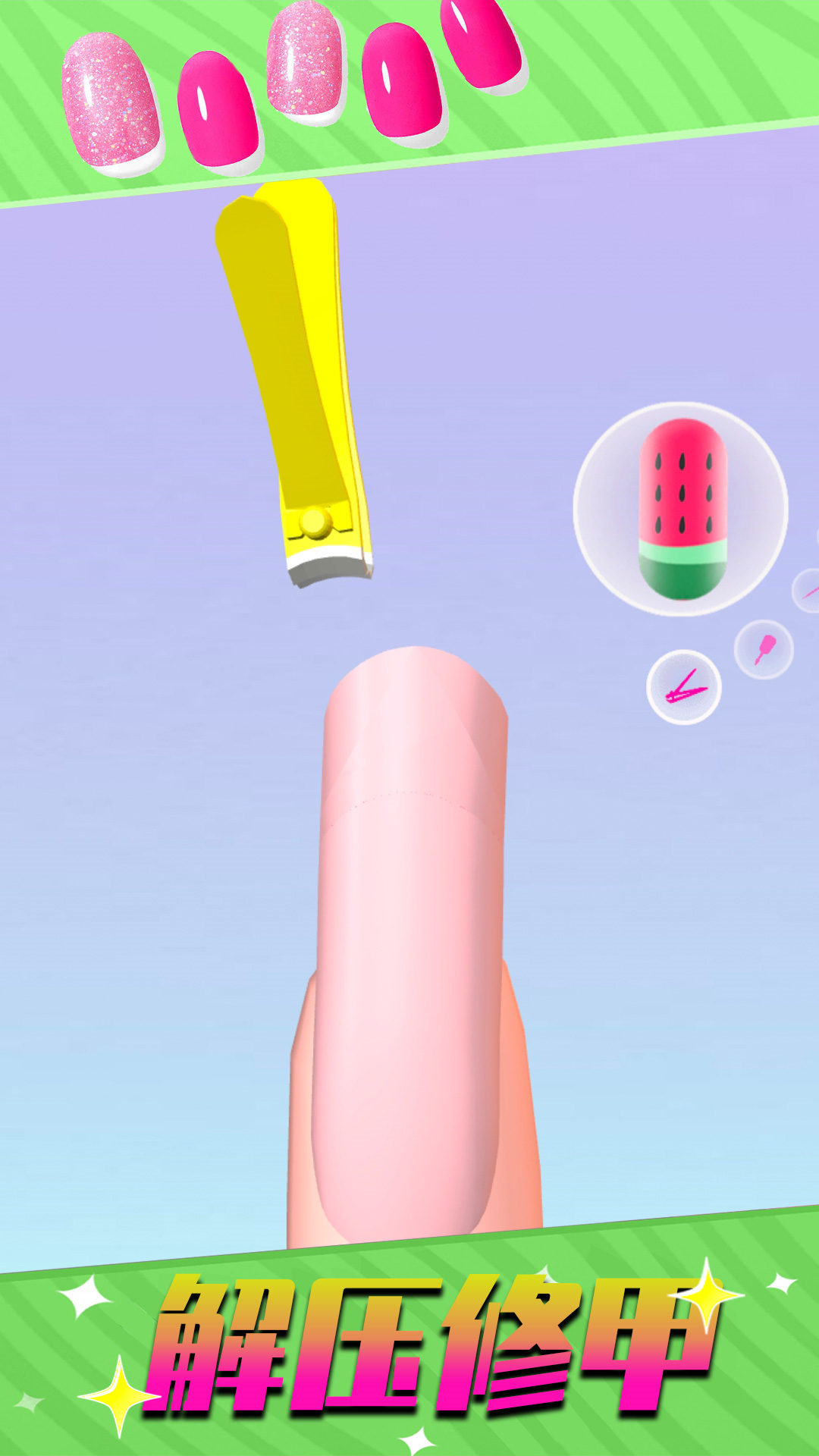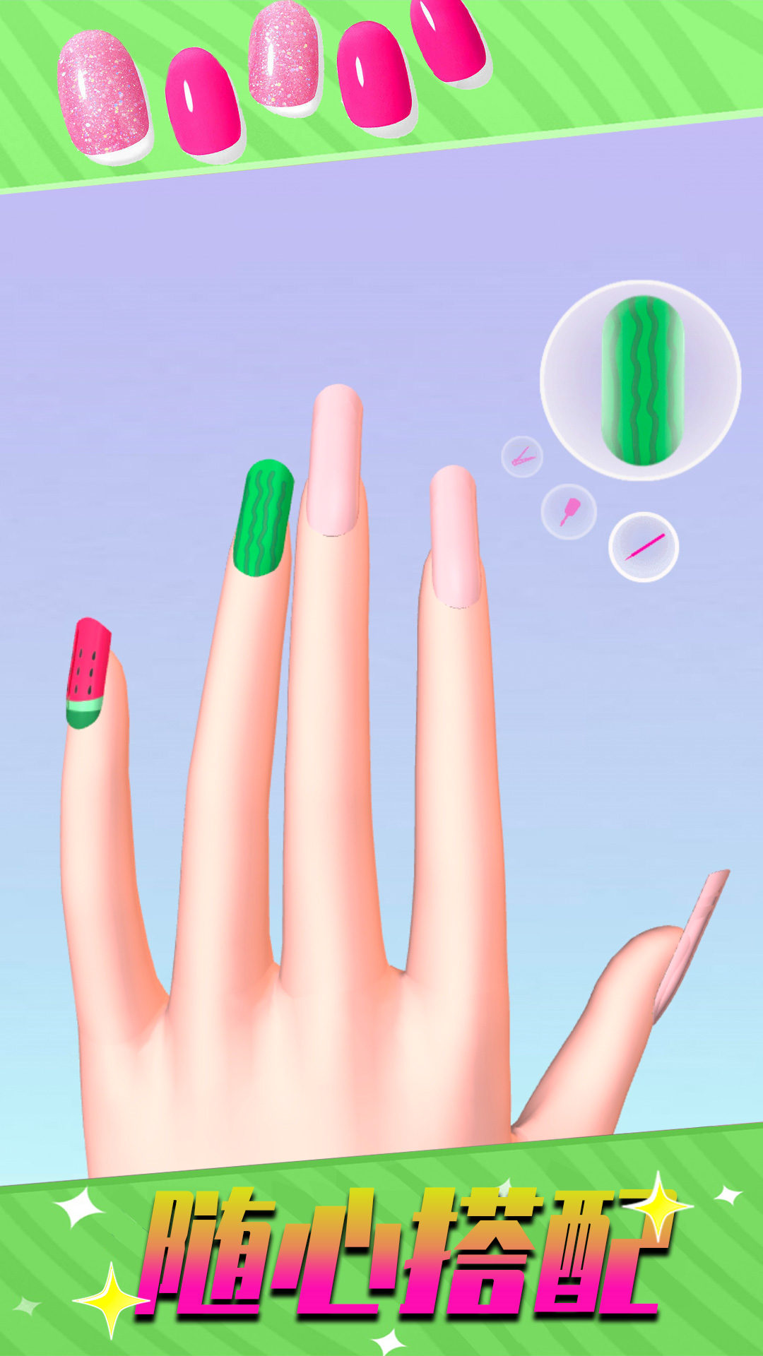 1、玩家可以选择不同的指甲形状,并涂上各种颜色,制作自己的美甲;