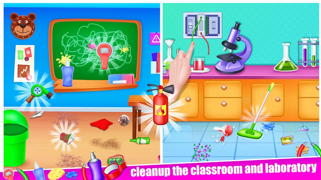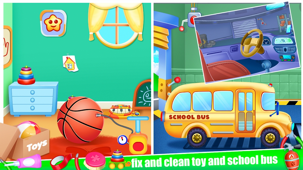 1、轻触屏幕,控制小猪移动和使用工具,扫地、擦窗、洗刷等动作一气呵成,真实还原家务过程;