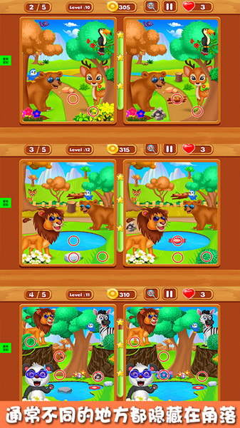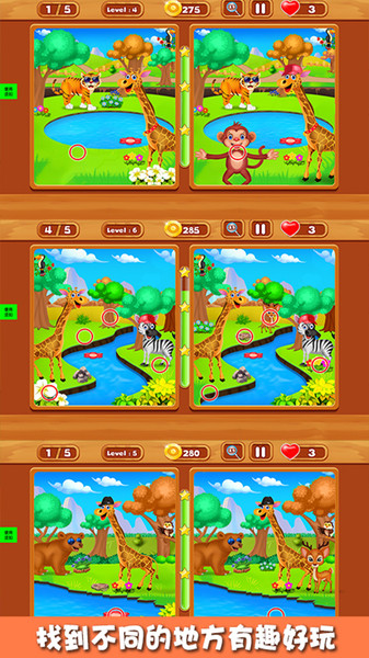 3、你需要找到两张相似图片之间的所有差异,并完成各种挑战。游戏后期的关卡难度会逐渐增加,继续完成关卡任务,成为找茬的高手。
