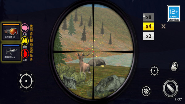 1、高度还原野外环境,逼真动物生态,提供沉浸式狩猎体验,考验玩家耐心与瞄准技巧;