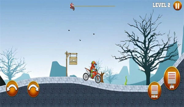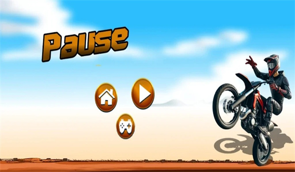 1、灵活控制摩托车加速、减速、跳跃,克服各种复杂路况,顺利到达终点;