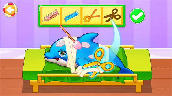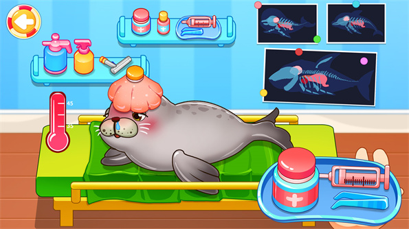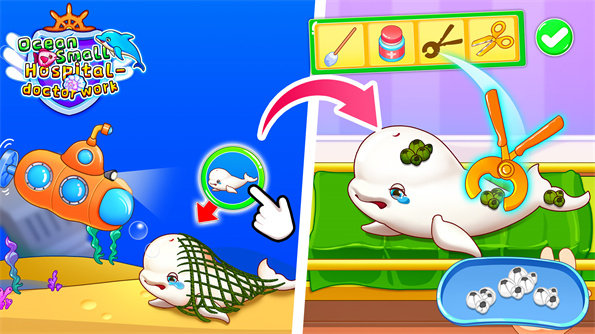 1、趣味互动玩法,亲手操作,为受伤海洋动物进行诊断与手术;