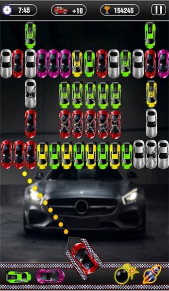1、瞄准发射彩色泡泡,至少三个同色相连即可消除,达成目标消去指定数量汽车;